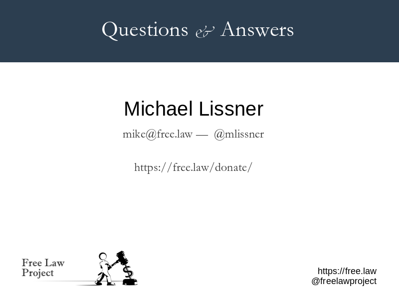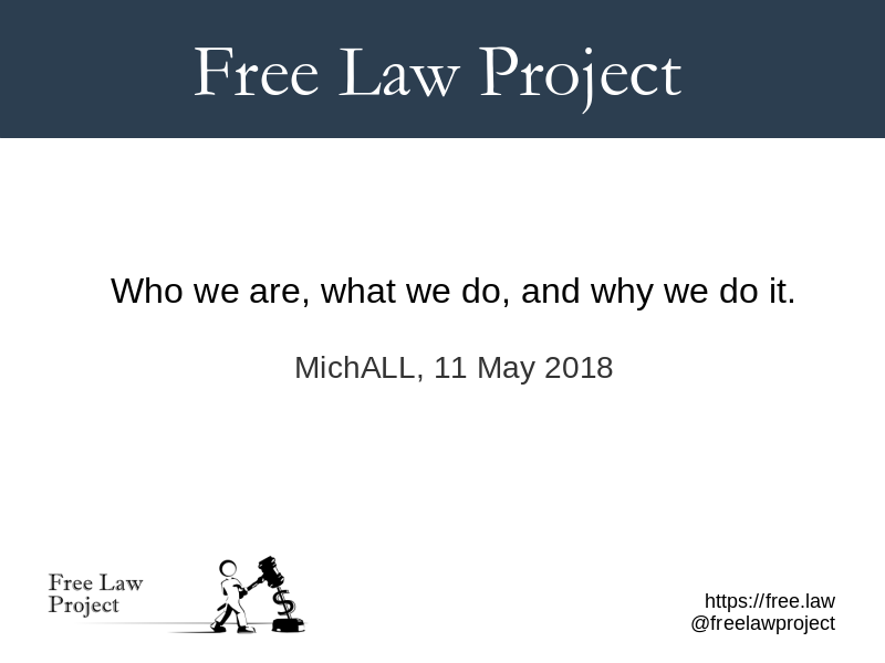 A few weeks ago I had the privilege and the pleasure of speaking at the Michigan Association of Law Librarians (MichALL) annual conference. The talk I gave was an overview of Free Law Project and all of our projects, initiatives, and advocacy.