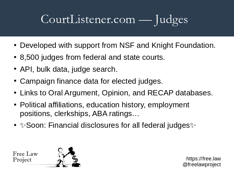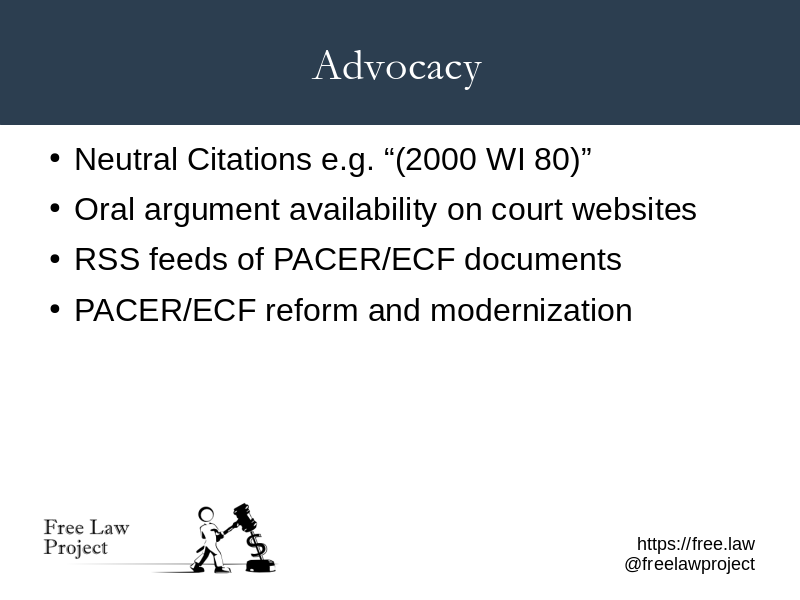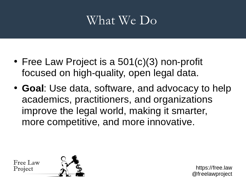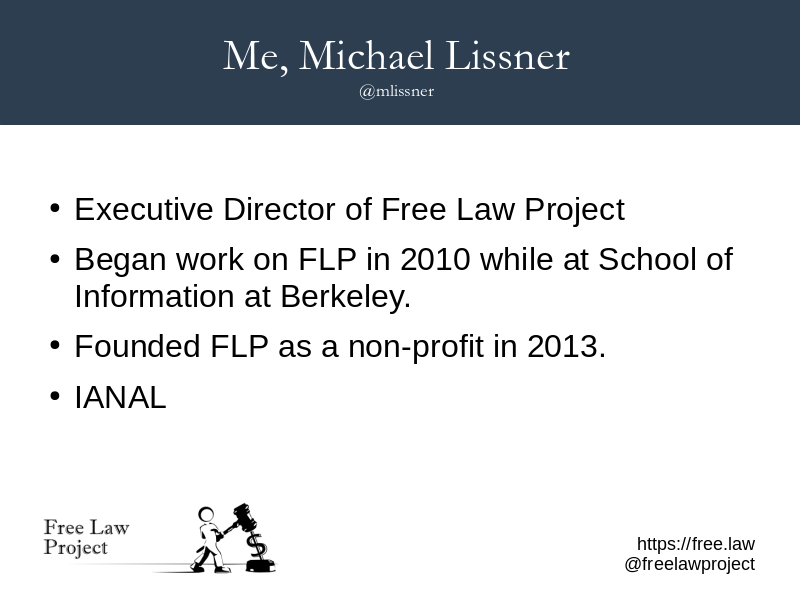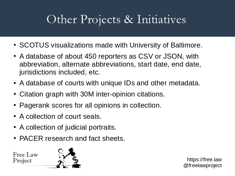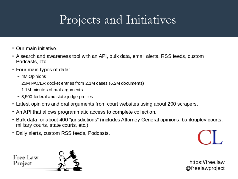 I'm often too busy working to remember to share everything we're working on at Free Law Project, so for the curious, here are the slides of my presentation.