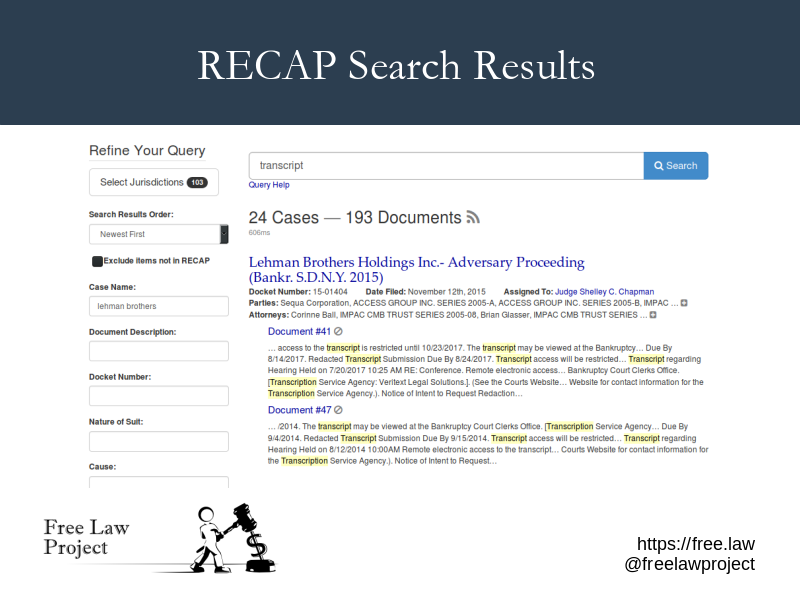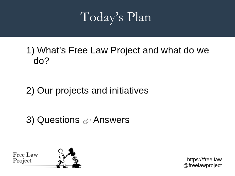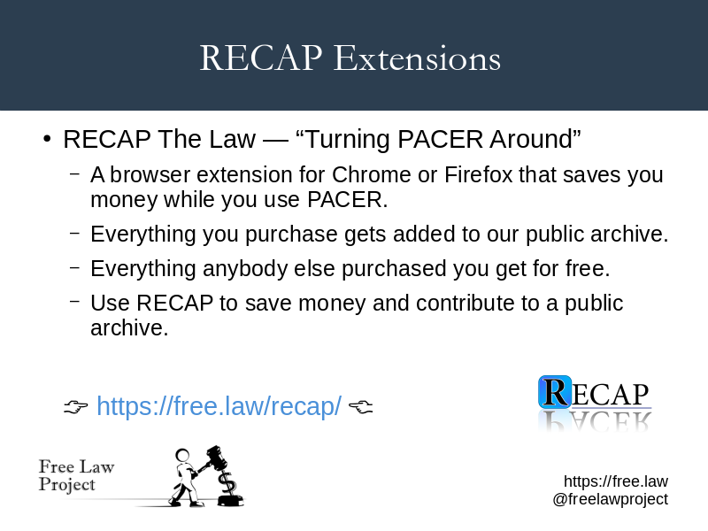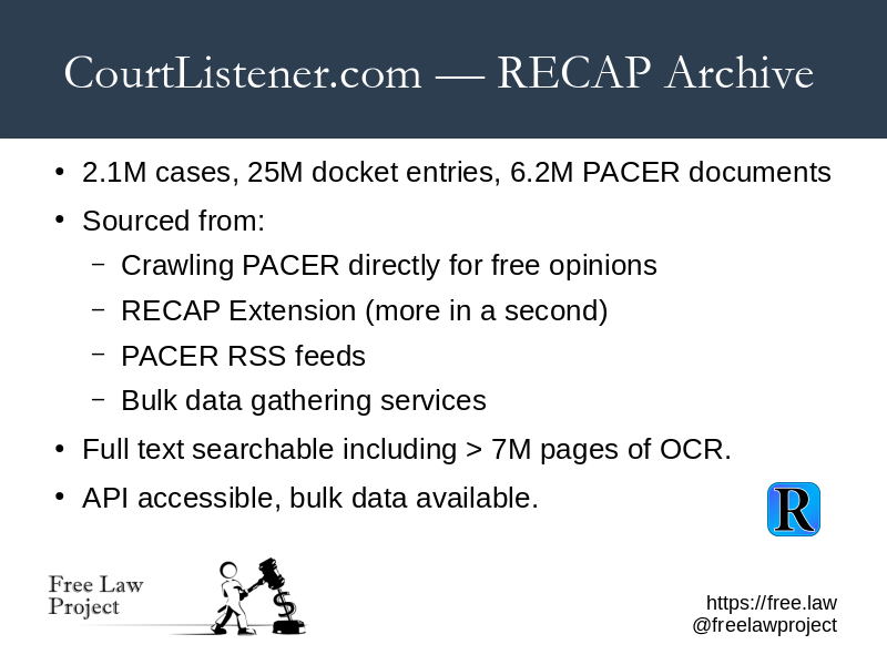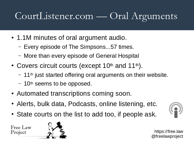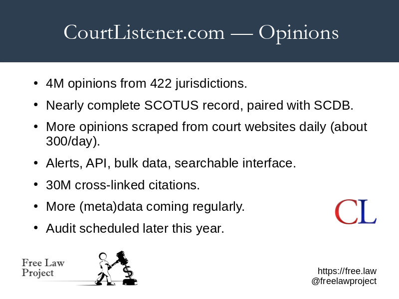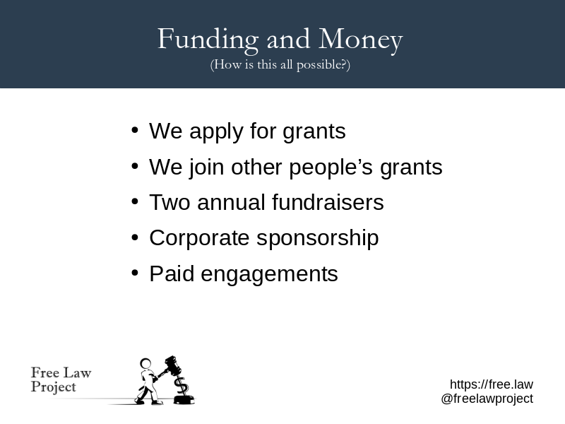 I'm often too busy working to remember to share everything we're working on at Free Law Project, so for the curious, here are the slides of my presentation.