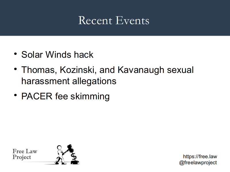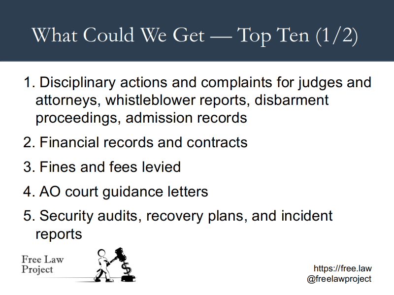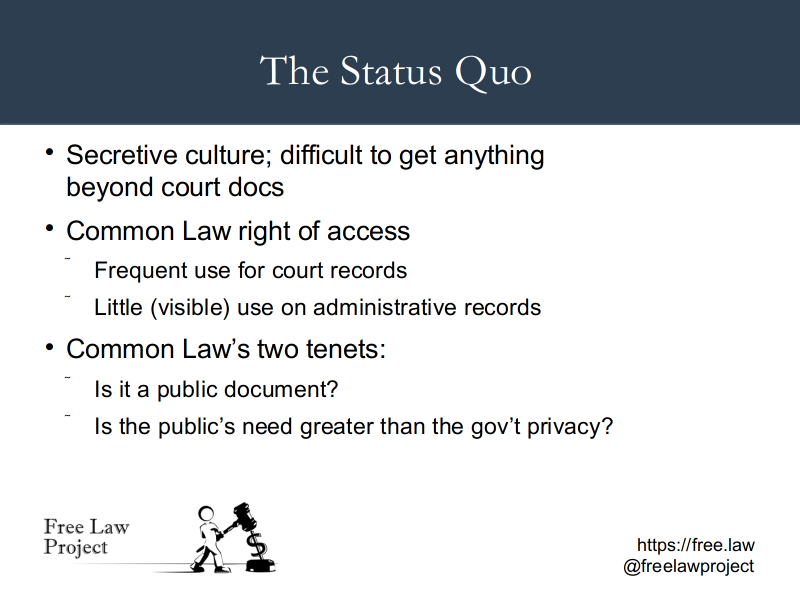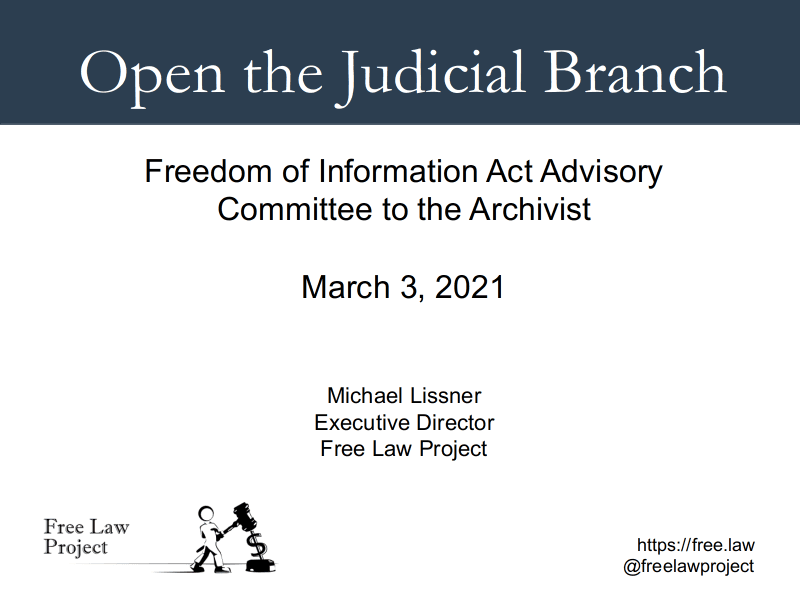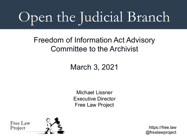 Yesterday, along with Daniel Schuman of Demand Progress, I had the privilege of presenting to the FOIA Advisory Committee to the Archivist of the United States. He presented on the topic of what public access, FOIA-like laws might look like in the Legislative Branch, while I focused on the Judicial Branch.