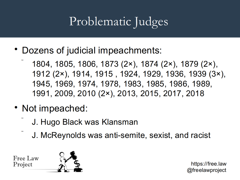 The point of these examples is to show that, like any public organization, the Judicial Branch is not free from scandals, and that further transparency would be good for the public and the branch itself. In other words, we need more transparency.