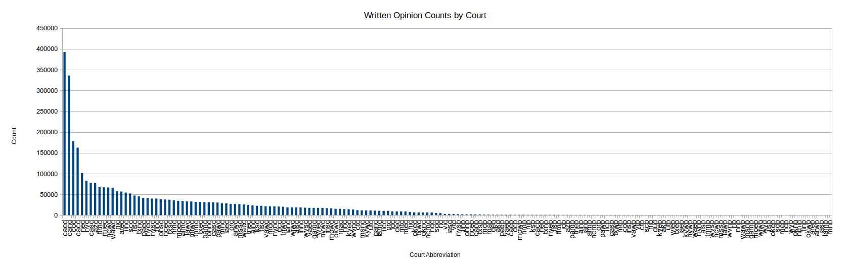 After downloading all of the written opinions, we completed a brief analysis (xlsx) and discovered that courts are wildly inconsistent about marking documents as opinions. For example, in our analysis we discovered that the busiest court in the country, NY Southern District (NYSD), has about 10% as many written opinions as California's Central District, and that NYSD comes in 21st place across the country when it should be first in terms of output.